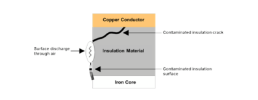 絕緣表面也會發(fā)生局部放電。二手旋轉設備通常在絕緣層的外面有一層污染層。如果絕緣表面上的這種“污垢”或水分不均勻或不連續(xù),則表面可能會放電。如下圖所示,如果從導體到絕緣體表面存在污染的絕緣裂紋或高導電路徑,則尤其如此。
